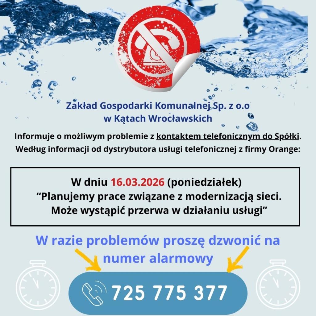 Zakład Gospodarki Komunalnej Sp. z o.o. informuje o awari sieci telefonicznej ze strony usługodawcy.